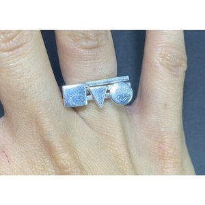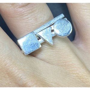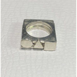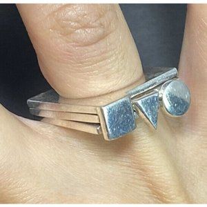 This is a beautiful 3 piece stack ring. Features geometric shapes square, circle, triangle on each band. Size 6 and altogether weighs 15.4 grams stamped 925