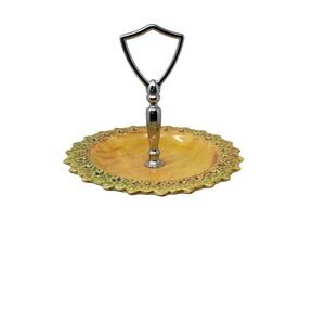 Vintage serving platters from the mid-century modern era, perfect for buffets. Features a stylish mustard avocado top handle. Ideal for serving tidbits or as a unique candy dish. A must-have collectible from the 1960s. Made in USA.