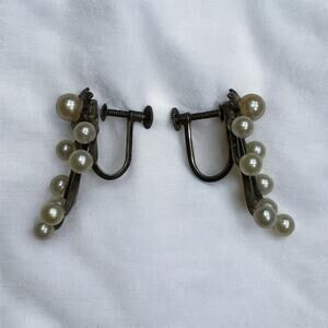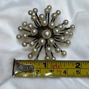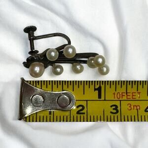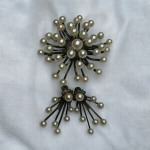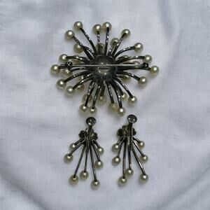 Gorgeous Vintage 1960s/1970s Mid Century Atomic Pearl Cluster Brooch and Matching Earrings made of Sterling Silver. They have a beautiful beautiful luster and all match. There is a very nice patina on the Sterling Silver elements on the brooch and earrings. The earrings are screwback. See pics for measurements.