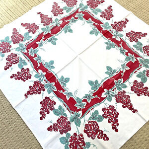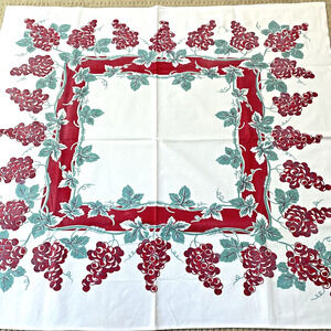 Vintage Mid Century Printed Cotton Tablecloth - fabulous vineyard theme in retro 1950's colors - red and minty green in a grape clusters and vines pattern border print. In excellent vintage condition with light overall wear and a bit of fading but no significant damage or flaws. Just charming!