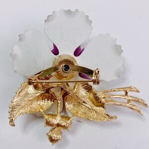 Features: Layered orchid-style design; shaded white enamel metal petals with molded lavender lucite center; prong-set aurora borealis rhinestones; gold tone textured leaves; rollover safety clasp