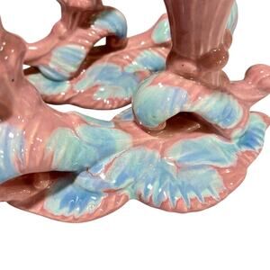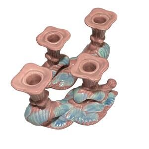 Vintage Mid Century Candle Holders - Royal Haeger pottery candelabra - a matching pair of double arm art pottery candle holders done in the pink & blue colors known as Mauve & Blue Agate with a shiny overall glaze. The original paper labels are now missing but this pair is in otherwise good condition - minor shelf wear and a couple tiny rub marks on the glossy finish. Add these to your collection today!