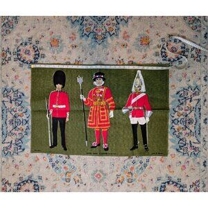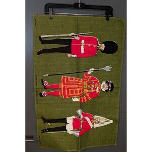 A pure Irish linen tea towel featuring 3 different Queens Guards on a green background. Never used, in pristine condition.
