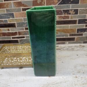 Vintage Mid Century Vase Green Ceramic Gold Metal Pierced Stand