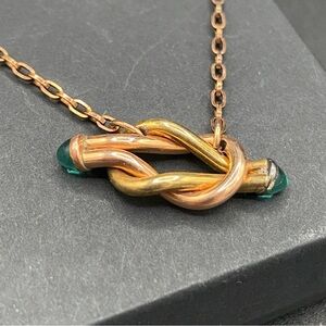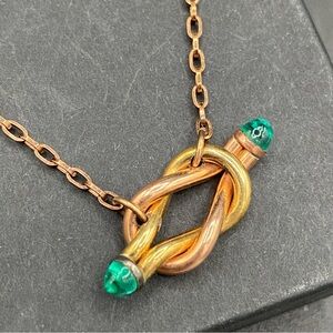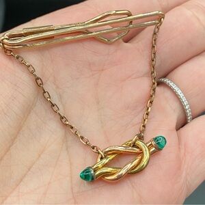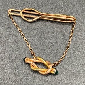Beautiful very old 1930-1940s love knot tie bar clip in bronze and gold tone colors with aqua green tips on the love kn ow