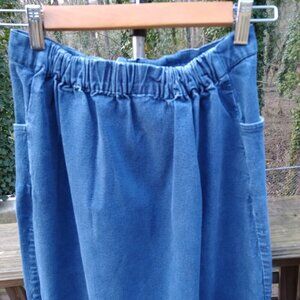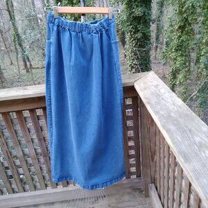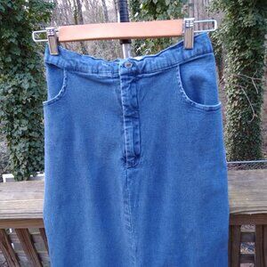 Vintage Mid Wash Denim Skirt Maxi Zip Front Pockets & Slit Elastic Back Sz S