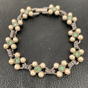 TAGS: mid-century bracelet, vintage bracelet, MCM bracelet, floral bracelet, antique silver finish, faux pearl jewelry, faux peridot crystals, 1950s style, vintage floral jewelry, heirloom piece, retro jewelry, green rhinestones, clean design, quiet statement, minimalist vintage, giftable