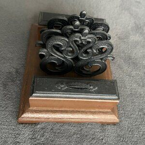 Vintage faux woodgrain desk organizer, mid-century modern. Ornate letter holder (three) and two lidded compartments to hold tape, paper clips and other desk items. Made of durable plastic. 8"w x 6-1/2"d x 6"h. In very good vintage condition.