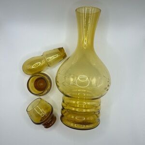 Beautiful mid -century petite etched yellow amber glass decanter with two tiny matching glasses. Perfect for serving your favorite beverages.