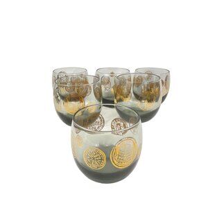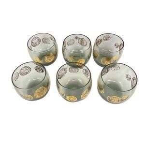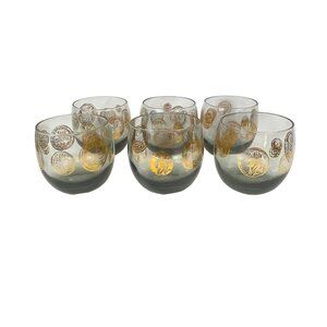 Vintage Mid-Century Lowball Glasses Set of 6 Coin Design 22K Gold Accents Smoky