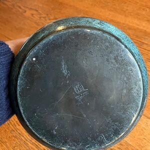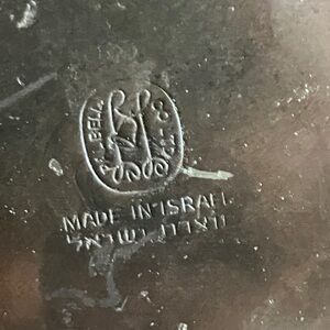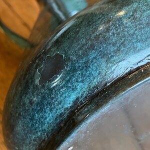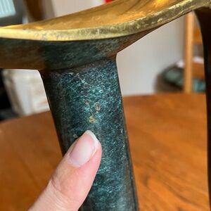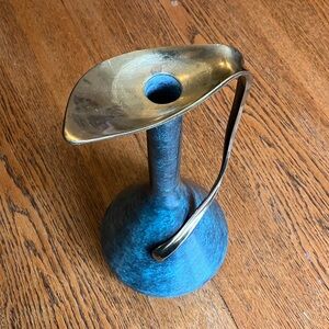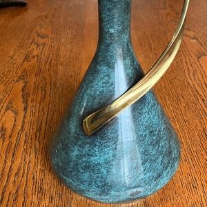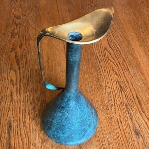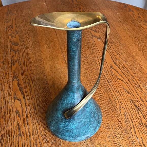 Vintage Mid-Century MCM 50’s/60’s Pal-Bell Co. Ltd. Brass Ewer Decanter Vase Made in Israel! Beautiful marble like Green finish and swirly brass handle make it a statement piece! Petal top (6” long horizontally) is beautiful and the base is 7” wide and neck is skinny. 1”. Handle is about 11” long! This decanter has some scratches and chips in small areas of the green base and under the petal rim on green neck, and small area on back of decanter has sticker residue for price tag that can come off with cleaning. On dent shown in the 3rd to last photo near the base. I have NOT polished or tried to clean it at all. Selling as is. Very rare and unique item! Height is 13.75 inches.