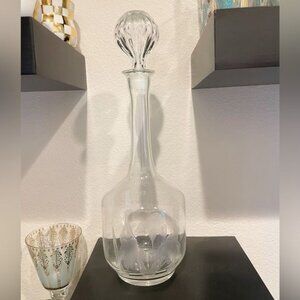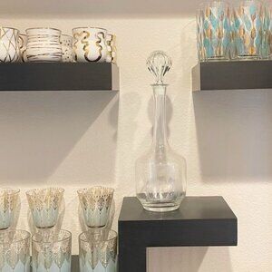 Elevate your home bar or dining space with this vintage etched floral glass decanter. Its intricate lily design and starburst stopper add timeless elegance.