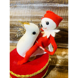 Vintage Mid-Century Musical Flocked Elf Riding a Dove Christmas Decor