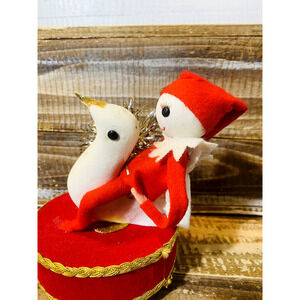 Vintage Christmas Elf, Pixie Elf Decor, Retro Holiday Decoration, Musical Elf Figure, Mid Century Christmas, Flocked Elf Ornament, Elf Riding Bird, Kitsch Christmas