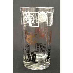 Add a touch of vintage charm to your barware collection with this set of four highball glasses. This item includes volume discount pricing which makes them very affordable if you're wanting a larger quantity. Each glass features a unique nautical/yacht design and are painted on clear glass with black, white, and gold accents! Perfect for all occasions, these glasses have a 12 oz capacity and are suitable for serving cold beverages. These round, tall highball glasses are 5 1/8 inches in height and have a diameter of 2.75 inches. Ideal for collectors, these glasses would make a great addition or display for your barware and could also be used as an iced tea or everyday drinking glass! Serve your guests in style with this four-piece set of mid-century glasses and make this a part of your collection today! 225