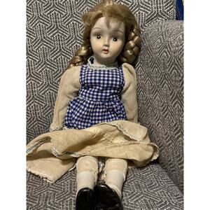 Vintage Mid-Century Porcelain Doll Blonde Braids Blue Gingham Dress. Believed to be from the 1940’s -1950’s. Overall good condition. Length
