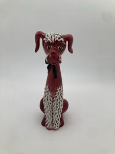 Striking mid-century red ceramic poodle figurine featuring hand-applied white textured fur detailing and a glossy glaze finish. This tall, stylized poodle has a charmingly exaggerated form typical of 1950s–1960s design, with a black ribbon bow accent and expressive painted eyes.