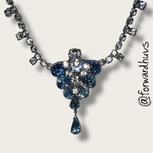 Vintage Mid-Century Rhinestone Necklace – Floral Cluster with Teardrop Pendant – Clear & Blue Stones – Approx. 15”
