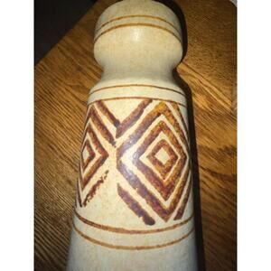 A cylindrical vintage Pottery Craft vase, made in Compton, California. The company is associated with Robert Maxwell and David Cressey, will fit into any mid-century or rustic decor. Dark brown geometric design on a grey-white ground.