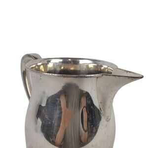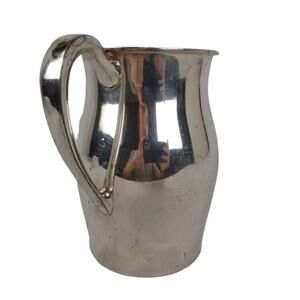 This vintage mid-century water/cocktail pitcher features a silverplate finish. There are no maker's marks, looks similar to pieces by Wm Rogers, Sheridan and Bristol. It has a simple minimalist design.