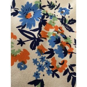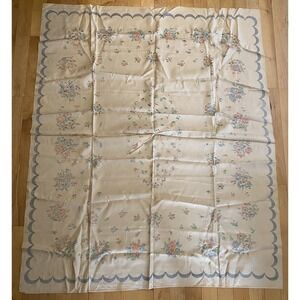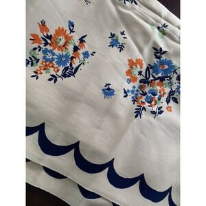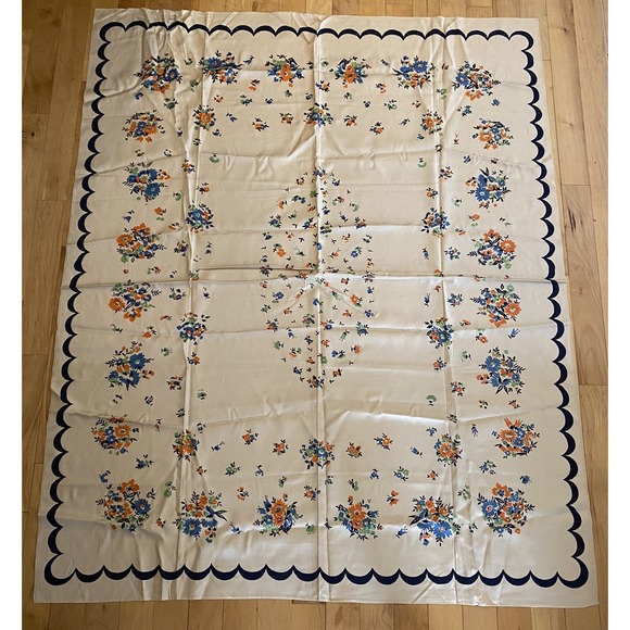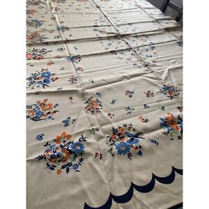 This vintage mid-century tablecloth features a beautiful floral pattern in blue and orange colors, perfect for a cottage core aesthetic. With a rectangular shape and dimensions of 4'x5', this original tablecloth from the 1950s adds a touch of retro charm to any occasion. Machine washable and made in the United States, this unique piece is a must-have for collectors of kitchen linens and textiles.