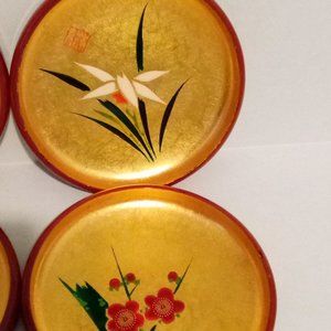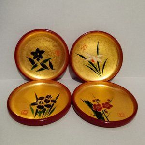Vintage Mid-Century Japanese Lacquerware Bowls. These beautiful bowls feature Iris and Orchid hand painted designs and gold gilt. They will look amazing in a display and are perfect for year-round use. Made of wood. Signed with Asian characters on front of each plate. The bottom of them is painted a red-orange color. Use them in a spring vignette, or a table top display. All 4 are in excellent vintage condition. There is some wear to the gold gilt, consistent with age. No chips, cracks, breaks, or repairs. Approx. 7" round.