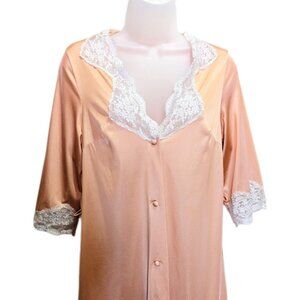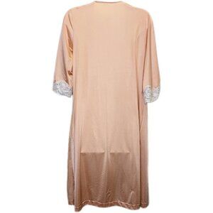 FEATURES/ACCENTS: Dusty peach V-neck 60s or 70s robe. Lightweight satiny nylon with 3/4 length bell sleeve. Midi length, Oversized fit, Shift. Ivory lace Trim on collar and wrists. Button up. Side seam pockets.