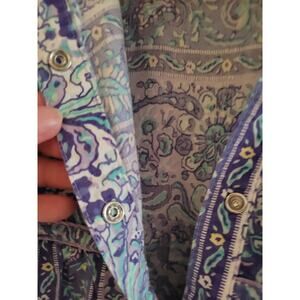 Purple, aqua, and white paisley floral print