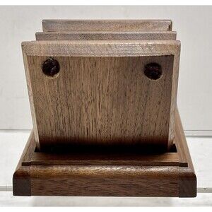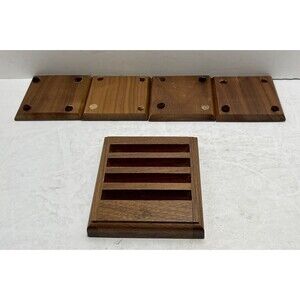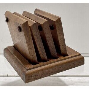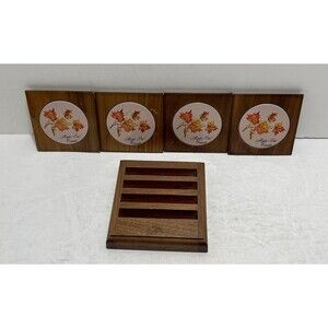 Vintage Mid-Century Modern Walnut Coaster Caddy w/ Enameled/Painted Maple Leaf on Ceramic. Pre-Owned & in Good Condition. It does show some wear as shown on pics. Some Coasters are missing the felt underneath which can easily be replaced.
