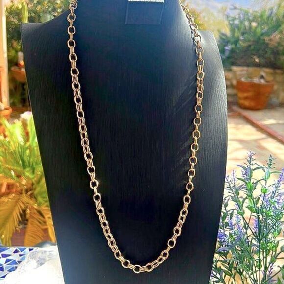 Gorgeous vintage infinity chain (over the head) from the 50’s/60’s. Somewhat oversized links - each one doubled - one smooth and one with textured detailing. 30” in total. Unmarked. Mellow old gold tone (SO much better than the new stuff!).