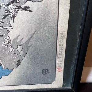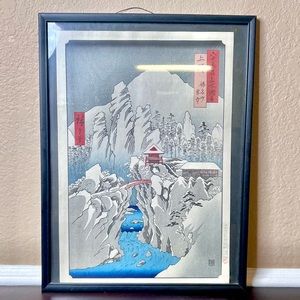 Amazing midcentury print of artist Utagawa Hiroshige's "Mount Haruna Under Snow" woodblock ink and watercolor print. Utagawa Hiroshige (1797-1858) practiced in a Ukiyo-e collaborative print process that included the artist, the carver, printers and publishers. This allowed for a high grade of consistency and quality with multiple professional eyes 'weighing in' on the merit and salability of a particular piece.