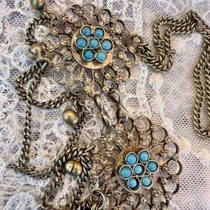 6 sun medallions in all with draped festoon curb chains and the small "bells" one sees so often in these pieces. The turquoise beads have slight variations in color & sizes - possibly hand blown. Simple hook clasp.