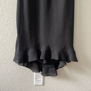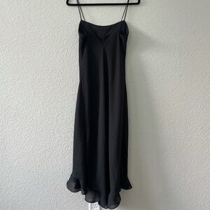 Description: amazingly understated quiet luxury spaghettis strap black midi slip dress with a ruffled hem