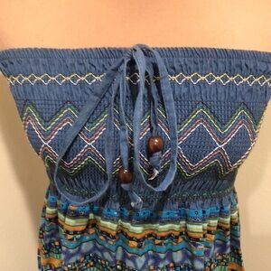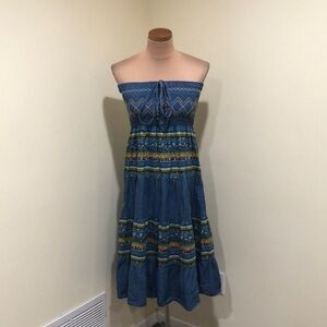 Excellent condition no stains rips or fading. Strapless, stretchy shirred bust, fit and flare silhouette midi dress with colorful embroidery on the bust and print on the skirt portion. No tags inside but would fit small through medium. It is modeled on a mannequin with 36.5” bust and 28.5” waist and was not tight.