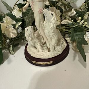 This vintage Miguel Angel porcelain figurine features a hand-painted lady in a cream dress with a pink accent, accompanied by two dogs. The figurine stands 10 inches tall with a 5-inch diameter and rests on a wooden base. Delicate details highlight the lady’s elegant attire and the charming dogs at her feet, making it a timeless collectible piece.
