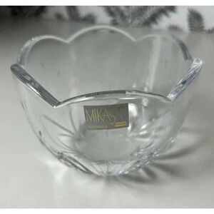 Vintage Mikasa Lead Glass Candy Dish ~ Bowl w/ Etched Leaves & Scalloped Edge