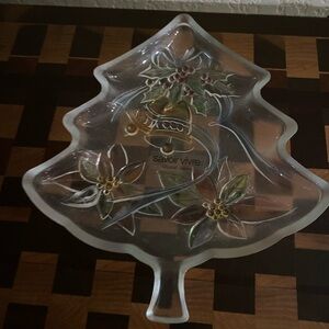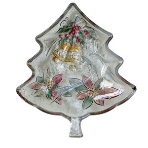 Elegant tree-shaped glass dish featuring a festive Poinsettia and Bell design with red, green, and gold accents. Perfect for holiday decor.