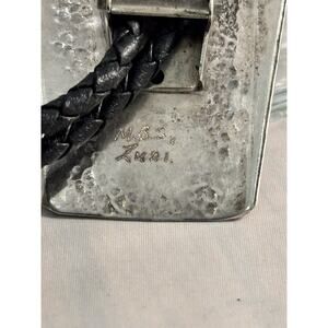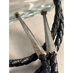 The Vintage Mike Simplicio Zuni Sterling Turquoise MOP Horse Inlay Bolo Tie is a handcrafted piece of Native American jewelry featuring beautiful turquoise stones set in sterling silver. The intricate horse head design, crafted from inlaid mother of pearl on a pen shell background, showcases the skill and artistry of the Zuni tribe. This unique bolo tie is signed by Mike Simplicio (MBS) and is a true vintage find. The piece is in very good condition.