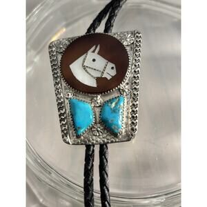 Vintage Mike Simplicio Zuni Sterling Turquoise MOP Horse Inlay Bolo Tie Signed