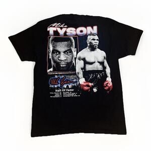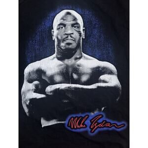 Bold Mike Tyson graphic T-shirt featuring an intense portrait of the boxing icon. Tagged size Large — measurements are 21” pit-to-pit x 28” length. Pre-owned in good condition with light natural wear. A perfect addition for fans of vintage sportswear, boxing memorabilia, or streetwear-style graphic tees. Ships fast and packaged with care.