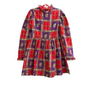 Oh how I love this one! Unique red and purple madras patchwork style pattern with ruffles on cuffs and collar. Milady Magoo brand. Size tag is gone but estimating about size 9-10 but please see photos for pics. Overall great condition but small hole by one back button. Not visible when buttoned/worn.