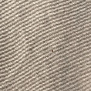 Wide, straight leg, sits above the waist, zipper fly, 100% non-stretch cotton, lovingly soft, one small mark, right leg is 1” longer than the left – an original detail I did not adjust