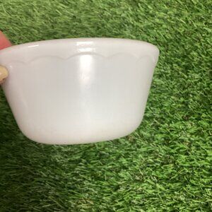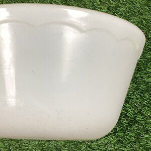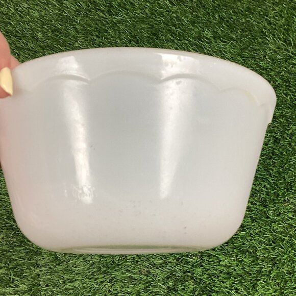 Vintage milk glass bowl with a scalloped edge on top. 5.5" wide and 3" tall. Good used condition. No name I can find.