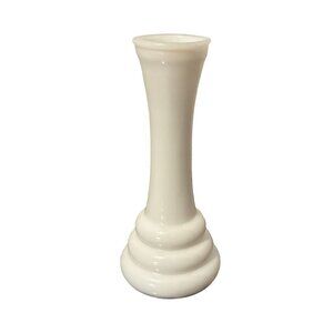 This vintage milk glass bud vase adds a touch of timeless elegance to any space. Its ribbed base and glossy finish complement floral arrangements or stand-alone display.