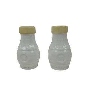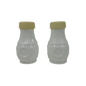 Enhance your dining experience with these vintage milk glass salt and pepper shakers. Featuring an eagle coin medallion design, they are perfect for collectors or as a unique gift. Made in the USA, these classic pieces add a touch of Americana to any kitchen.