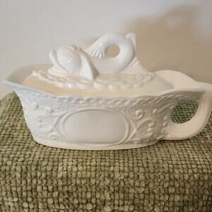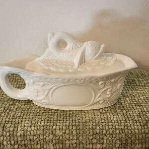Vintage Milk Glass Fish Covered Sauce Boat Tureen Mid Century Ocean Decor