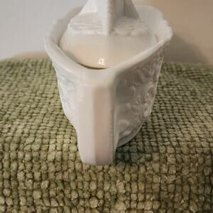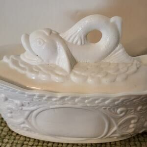 Add a splash of whimsy to your table with this vintage milk glass covered dish featuring a detailed fish handle resting on waves. This mid-century piece mimics classic Victorian EAPG design, with ornate embossed patterns and a smooth glossy white finish. Perfect as a gravy or sauce boat, candy dish, or unique coastal décor accent.