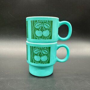 Vintage Milk Glass Mugs Hazel Atlas Teal Green Stacking Fruit Cherry Pear Apple