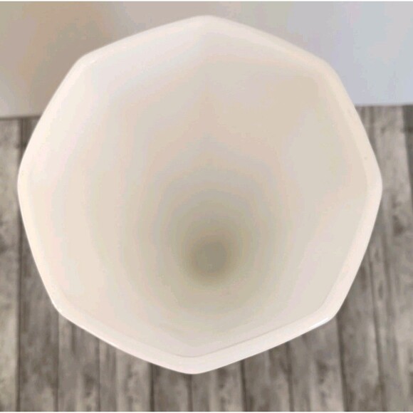 Vintage white milk glass footed vase with a gorgeous raised paneled grape and leaf design. Classic piece of Mid-century pressed glass. The tall hexagonal shape sits on a sturdy footed base. 10in tall, 4.5" wide, 1lb 14oz. No cracks or chips excellent pre-owned condition.