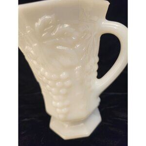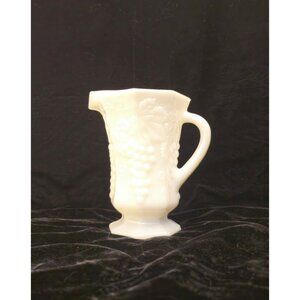 This vintage milk glass pitcher features a classic embossed grapevine motif, evoking timeless elegance. With its delicate hexagonal base and creamy translucent finish, it offers a touch of nostalgia and charm. Ideal as a decorative piece or functional item, it embodies craftsmanship and history in every detail.